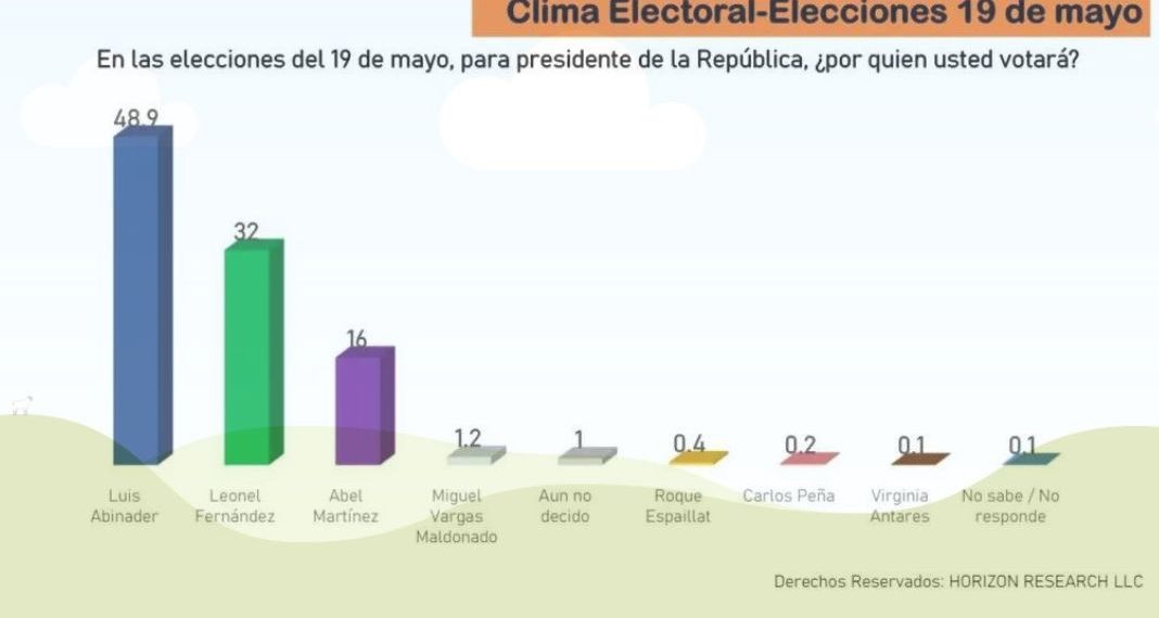 SANTO DOMINGO, RD.- La firma encuestadora Horizon Research dio a conocer el informe de resultados de la II Encuesta Nacional, Coyuntura Electoral República Dominicanacorrespondiente al mes de mayo 2024, según los cuales, si las elecciones fueran hoy, el presidente Luis Abinader obtendría un 48.9%,Leonel Fernández 32%, y Abel Martínez 16%.