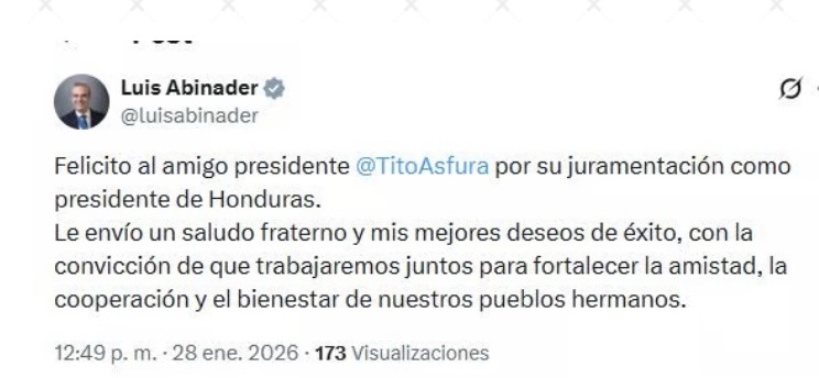 Santo Domingo, RD.– El presidente de la República Dominicana, Luis Abinader, expresó sus congratulaciones a Tito Asfura con motivo de su juramentación como nuevo mandatario de Honduras.