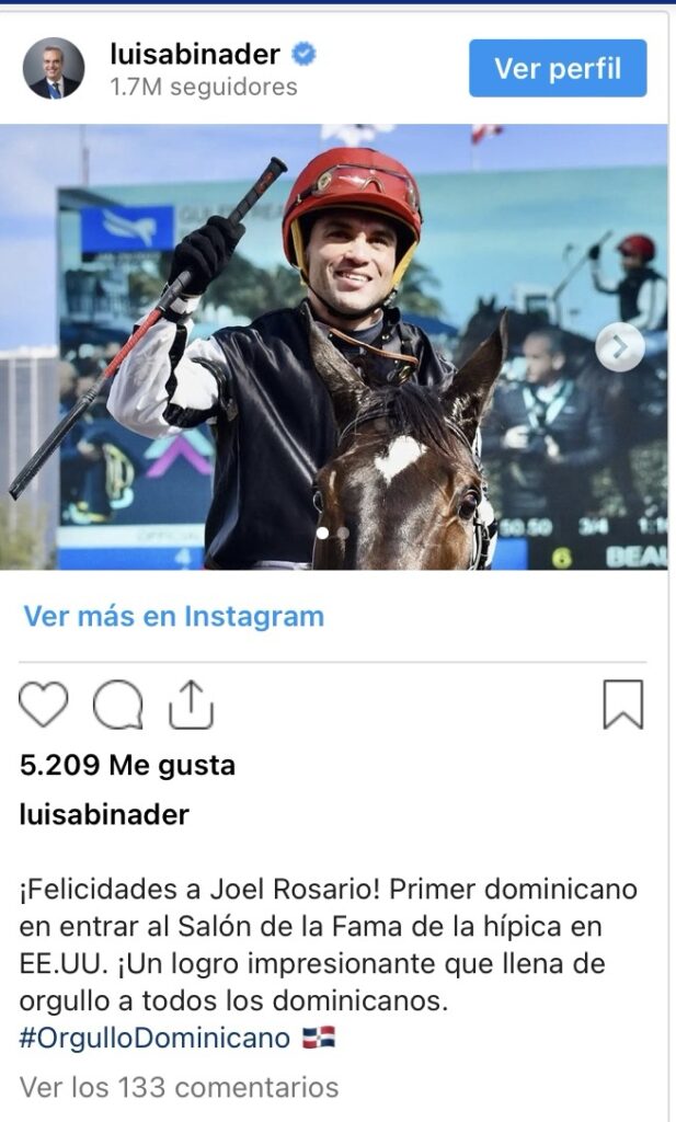 “¡Felicidades a Joel Rosario! Primer dominicano en entrar al Salón de la Fama de la hípica en EE.UU. ¡Un logro impresionante que llena de orgullo a todos los dominicanos!”, publicó Abinader en su cuenta de Instagram, acompañado del hashtag #OrgulloDominicano.