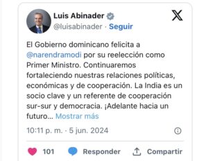 Mediante su cuenta de X (anteriormente Twitter), el mandatario dijo: «El Gobierno dominicano felicita a Narendra Modi, por su reelección como Primer Ministro. Continuaremos fortaleciendo nuestras relaciones políticas, económicas y de cooperación. La India es un socio clave y un referente de cooperación sur-sur y democracia. ¡Adelante hacia un futuro de éxito compartido!».