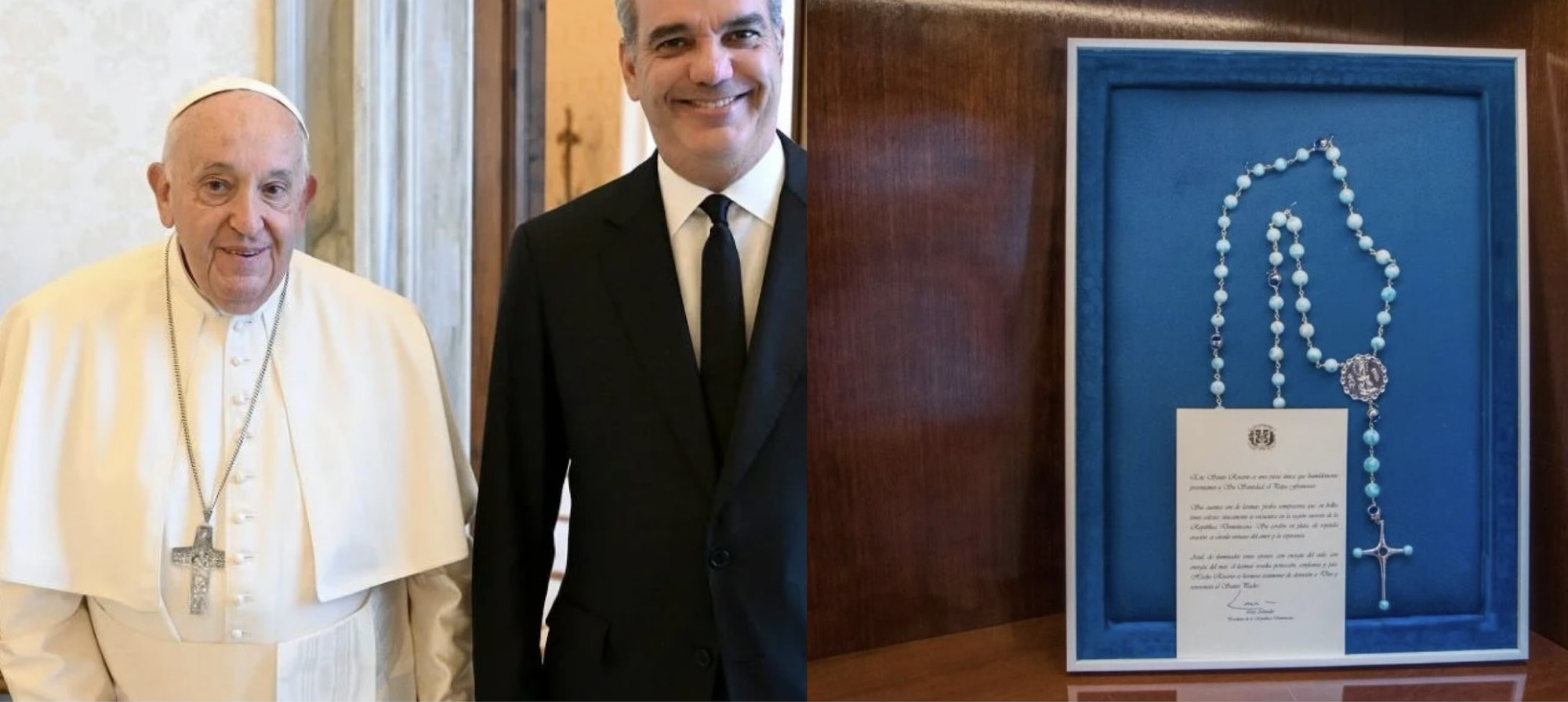 El presidente de la República, Luis Abinader, le obsequió al sumo pontífice Papa Francisco un Santo Rosario en plata y larimar.