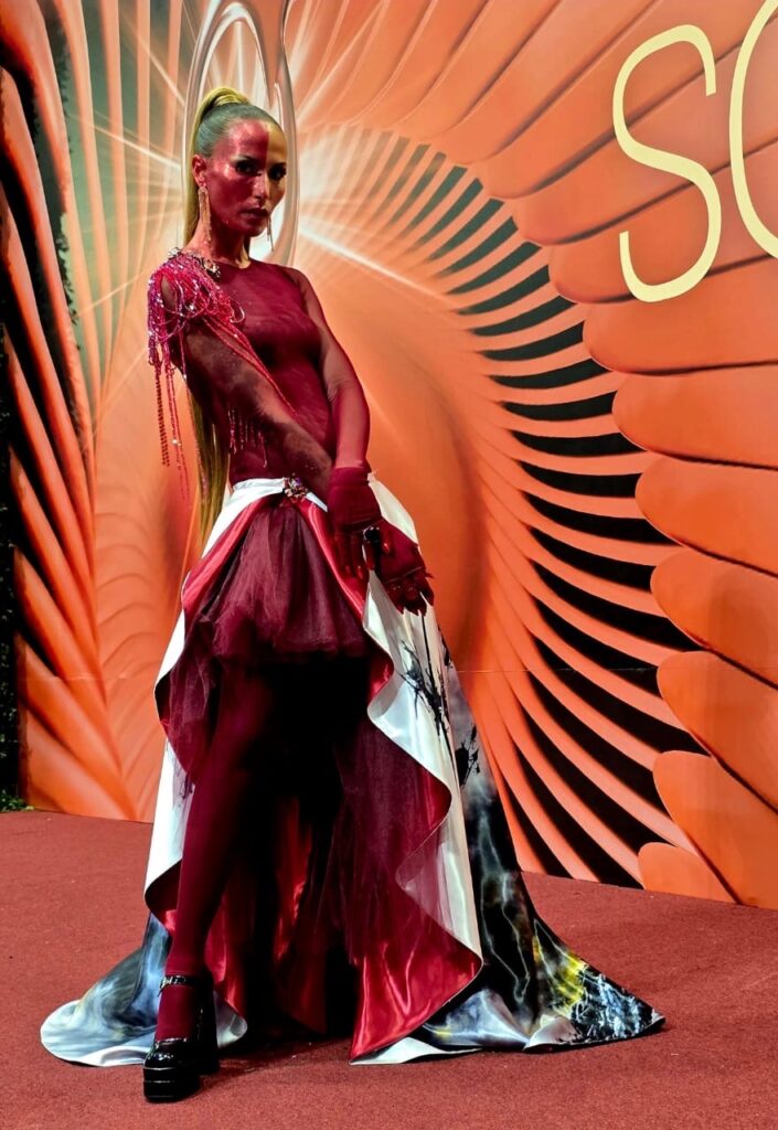 Santo Domingo, R.D.-La talentosa actriz Nileny Dippton, demostró, una vez más, su gran sensibilidad ante las graves problemáticas sociales, utilizando en la alfombra de los Premios Soberano, un impactante y exquisito vestuario, con el cual parecía estar cubierta de sangre, como protesta por las víctimas de la tragedia de la discoteca Jet Set y las guerras, que en este momento están afectando a gran parte de la humanidad.