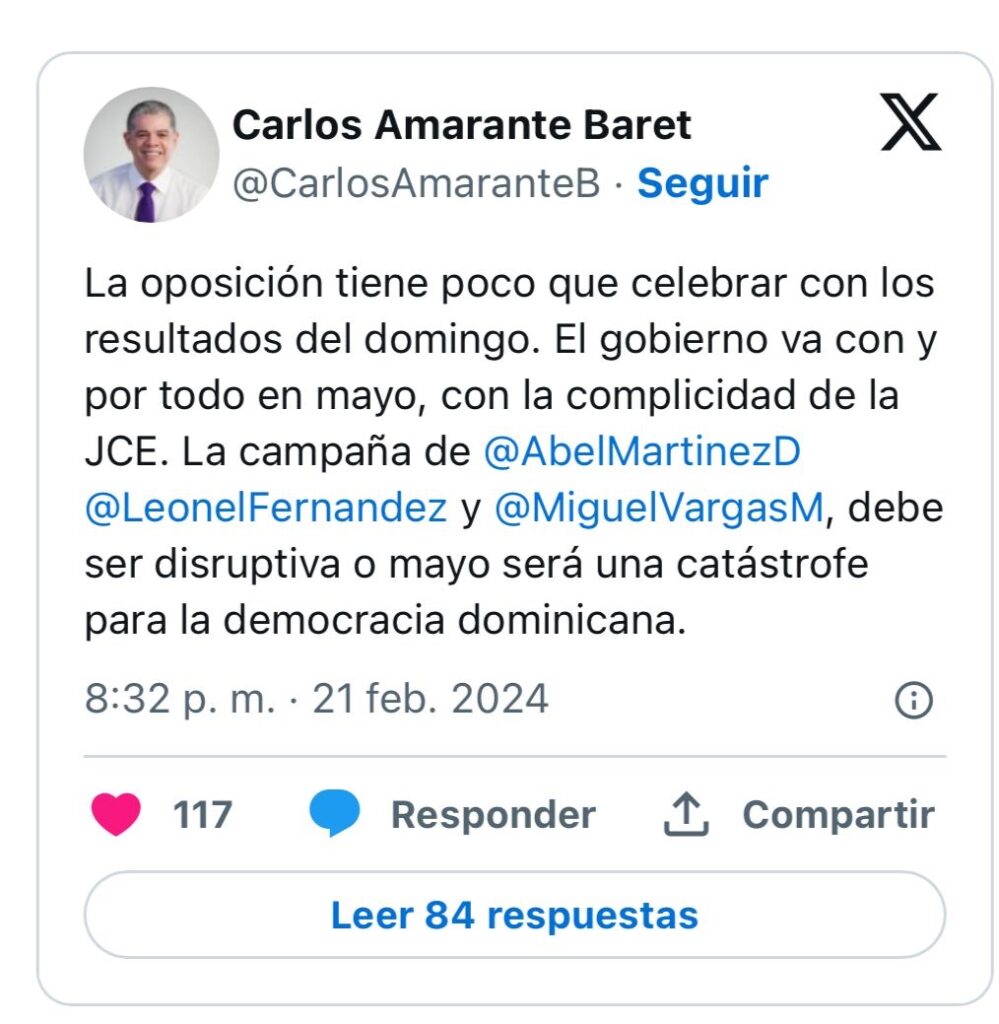 La oposición tiene poco que celebrar con los resultados del domingo. El gobierno va con y por todo en mayo, con la complicidad de la JCE. La campaña de @AbelMartinezD @LeonelFernandez y @MiguelVargasM, debe ser disruptiva o mayo será una catástrofe para la democracia dominicana.”, dijo Baret en su cuenta de X.