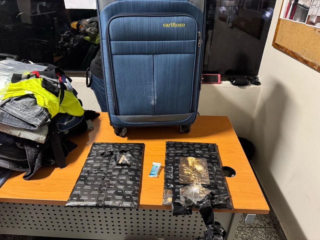 Por instrucciones del fiscal actuante, se abrió el equipaje, descubriendo un doble fondo, con dos paquetes (en forma de láminas), presumiblemente cocaína, envueltos en papel carbón, con un peso aproximado de 2.5 kilogramos.