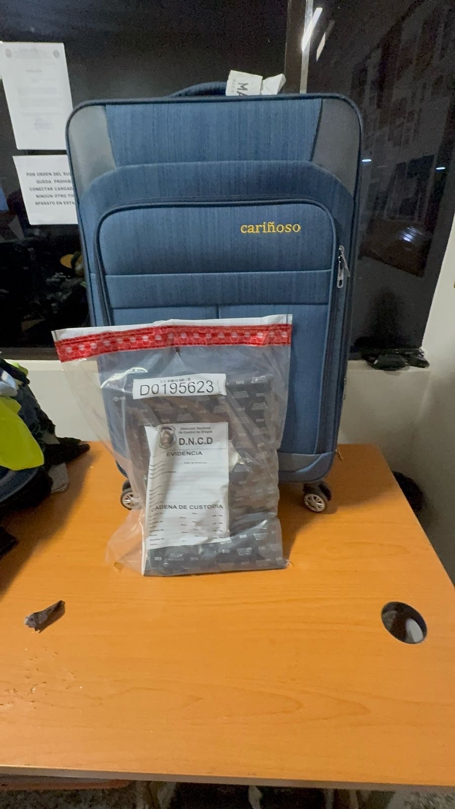 Por instrucciones del fiscal actuante, se abrió el equipaje, descubriendo un doble fondo, con dos paquetes (en forma de láminas), presumiblemente cocaína, envueltos en papel carbón, con un peso aproximado de 2.5 kilogramos.