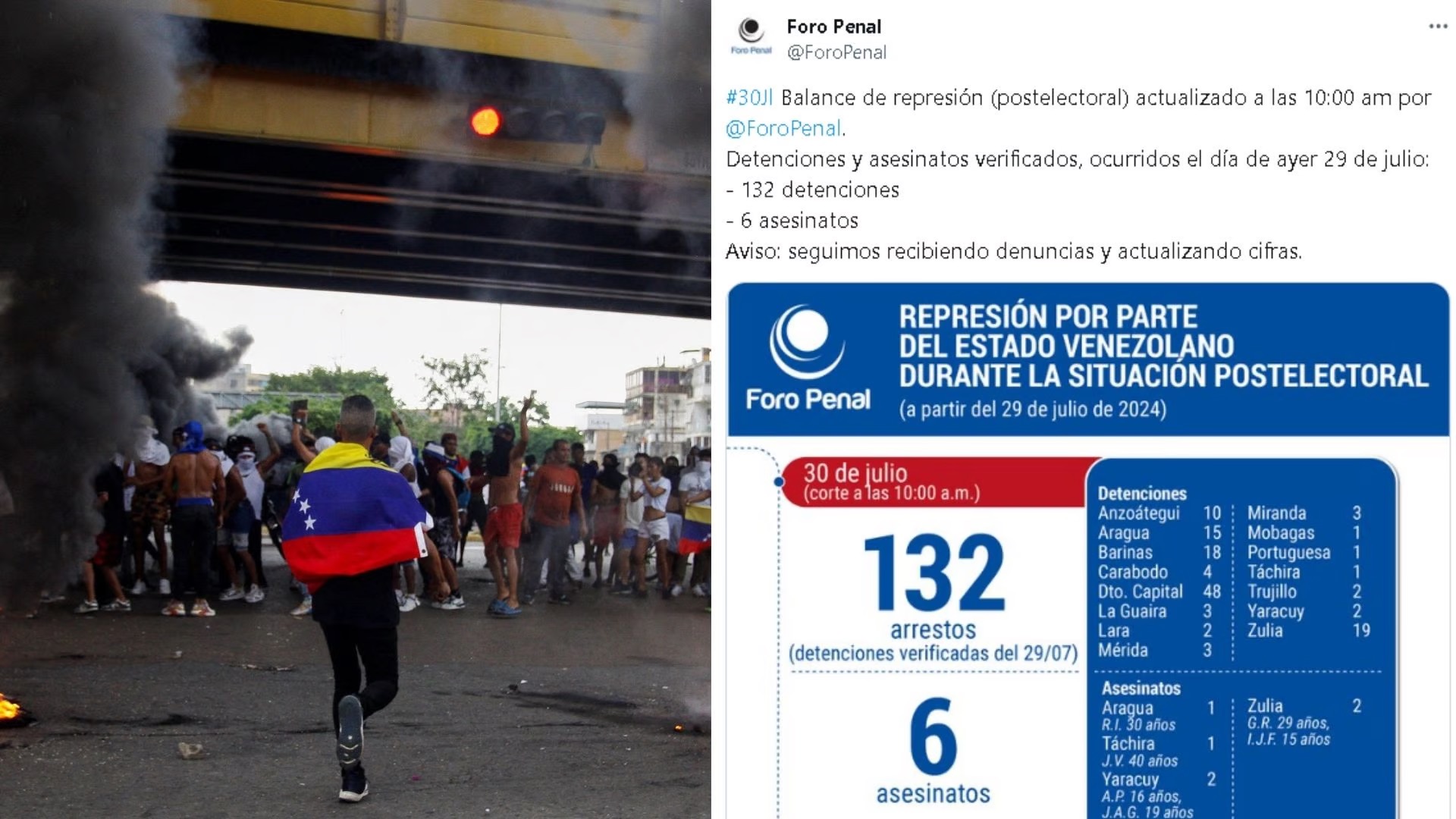 El Foro Penal confirmó que al menos seis personas murieronen el marco de las protestas generadas desde la mañana del lunes en Venezuela luego de que el Consejo Nacional Electoral (CNE) diera como ganador al Nicolás Maduro.