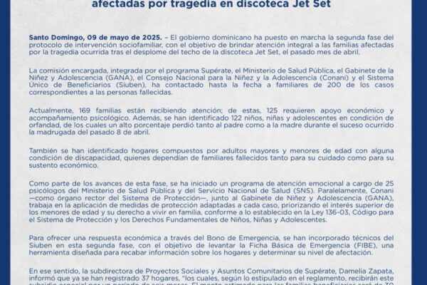 Viernes 9 de mayo,2025 Santo Domingo.-El gobierno dominicano ha puesto en marcha la segunda fase del protocolo de intervención sociofamiliar, con el objetivo de brindar atención integral a las familias afectadas por la tragedia ocurrida tras el desplome del techo de la discoteca Jet Set, el pasado mes de abril. La comisión encargada, integrada por…