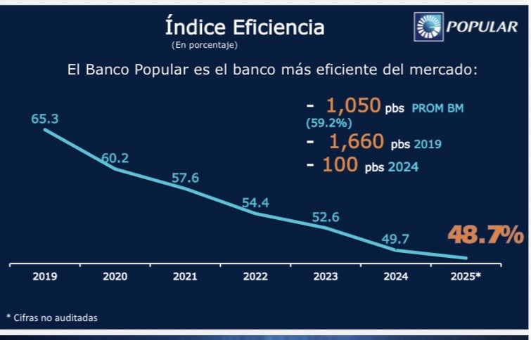 La eficiencia continúo siendo uno de los pilares estratégicos del Banco Popular. Al cierre del año, el índice de eficiencia cerró en 48.7%, consolidando al Popular como el banco más eficiente del mercado.