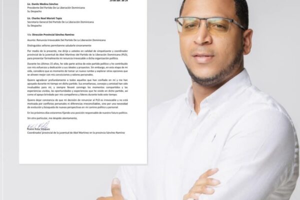 Martes 30 de abril, 2024 Renunció este lunes a las filas del Partido de la Liberación Dominicana (PLD), el coordinador de la juventud de Abel Martínez en la provincia Sánchez Ramírez, Roelvi Vásquez. En una carta dirigida a Danilo Medina y Charles Mariotti, presidente y secretario general del PLD, respectivamente, Vásquez presentó su renuncia irrevocable…