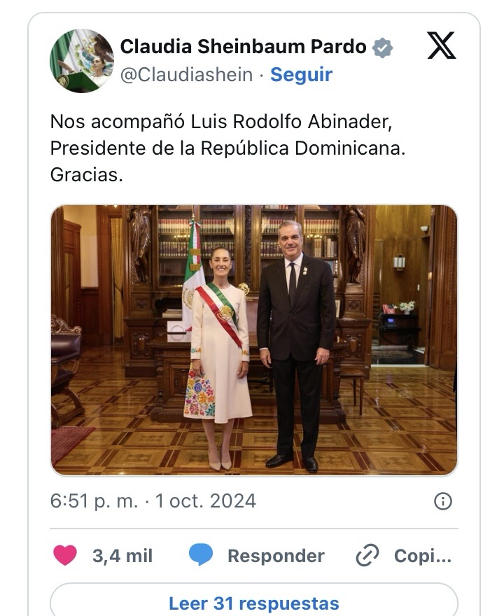 Claudia Sheinbaum, la primera mujer en asumir la presidencia de México, expresó su agradecimiento al presidente dominicano, Luis Abinader, por haber asistido a su ceremonia de juramentación. A través de un mensaje publicado en la red social X (anteriormente Twitter), Sheinbaum destacó la importancia de la cooperación entre países latinoamericanos y valoró la presencia de Abinader en este evento tan significativo.