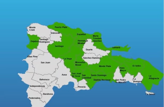 Las provincias en alerta verde son: Santo Domingo, Distrito Nacional, Monte Plata, Hato Mayor, La Vega, Espaillat, San Cristóbal, La Altagracia, María Trinidad Sánchez, Hermanas Mirabal, San José de Ocoa, Monseñor Nouel,Dajabón, Puerto Plata, Samaná, El Seibo y Santiago.