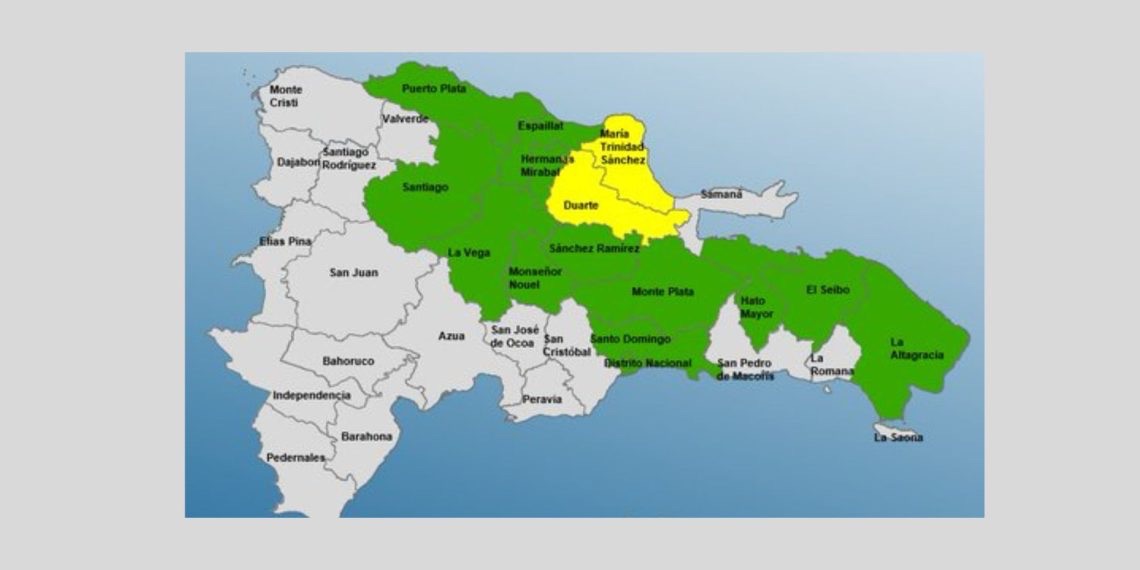 Mientras que en alerta verde están: Sánchez Ramírez, La Altagracia, La Vega, Santiago, Hermanas Mirabal, Monte Plata, Monseñor Nouel, Puerto plata, Espaillat, El Seibo, Hato Mayor, Santo Domingo y el Distrito Nacional.