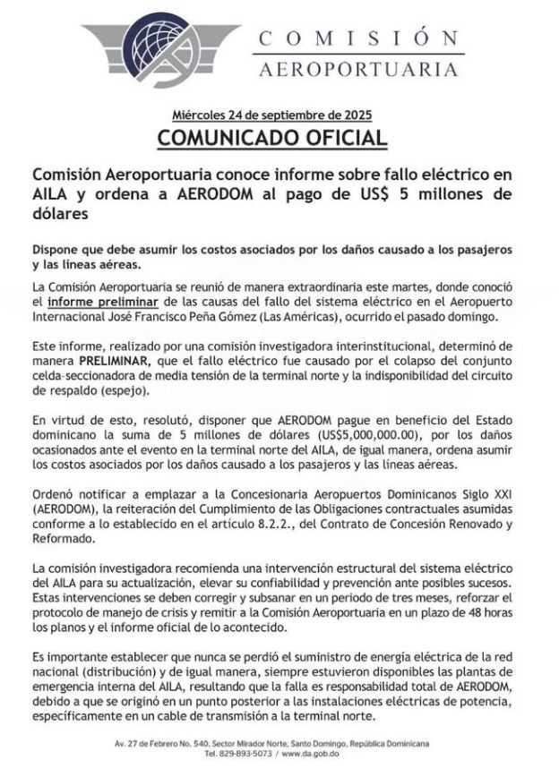 Santo Domingo.– La Comisión Aeroportuaria ordenó a Aeropuertos Dominicanos Siglo XXI (AERODOM) pagar 5 millones de dólares al Estado dominicano tras el fallo eléctrico ocurrido el pasado domingo en el Aeropuerto Internacional de Las Américas, José Francisco Peña Gómez (AILA).