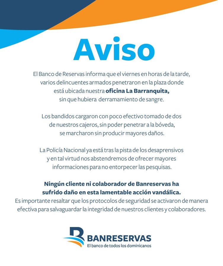 «Ningún cliente ni colaborador de Banreservas ha sufrido daño en esta lamentable acción vandálica», explica la entidad.