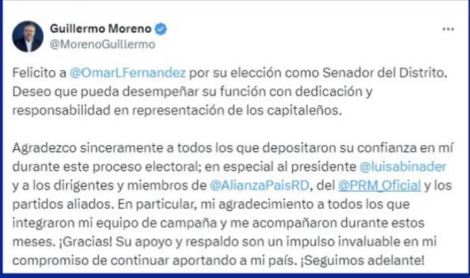 Agradezco sinceramente a todos los que depositaron su confianza en mí durante este proceso electoral; en especial al presidente @luisabinader y a los dirigentes y miembros de @AlianzaPaisRD, del @PRM_Oficial y los partidos aliados. En particular, mi agradecimiento a todos los que integraron mi equipo de campaña y me acompañaron durante estos meses. ¡Gracias! Su apoyo y respaldo son un impulso invaluable en mi compromiso de continuar aportando a mi país. ¡Seguimos adelante!