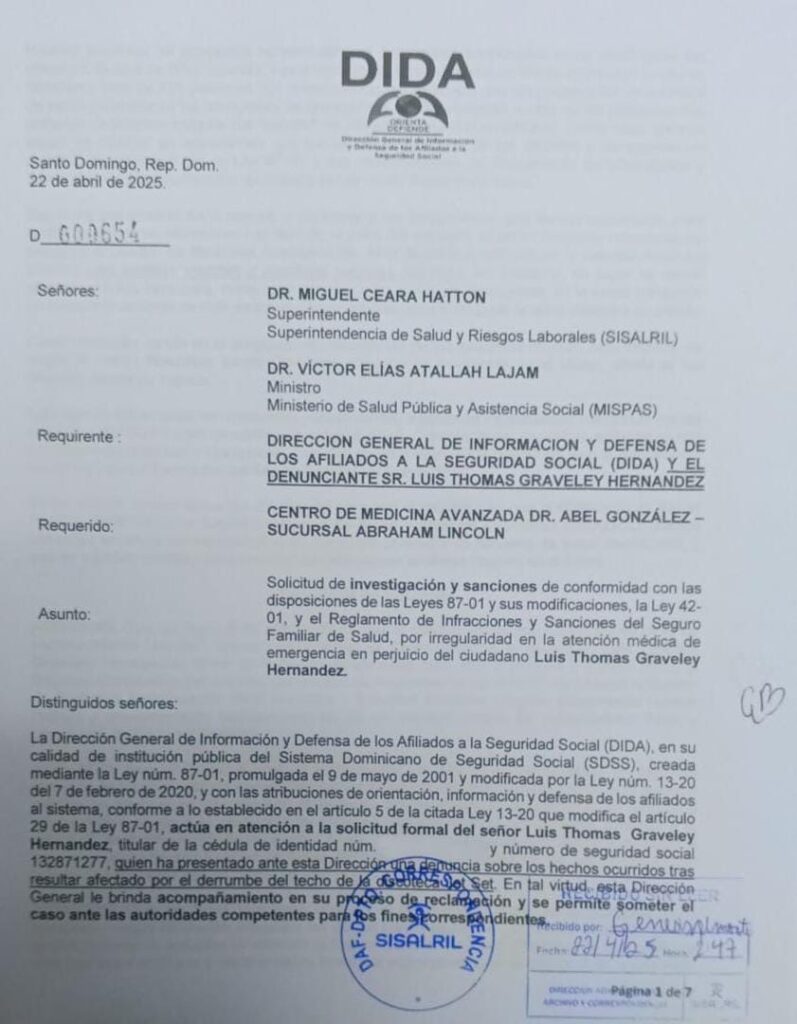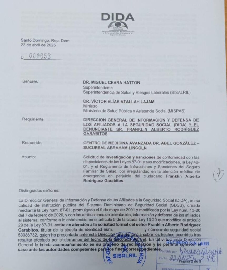 Santo Domingo-. La Dirección General de Información y Defensa de los Afiliados a la Seguridad Social (DIDA) informó que ha solicitado sanción ante la Superintendencia de Salud y Riesgos Laborales (SISALRIL) por la presunta negación de atención médica en situación de emergencia a los afiliados Franklin Rodriguez y Luís Graveley ocurridos en la clínica Abel González, sucursal Lincoln, en el Distrito Nacional.