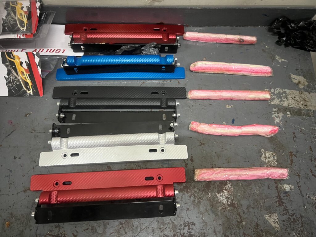 Los equipos actuantes, asistidos por unidades caninas, detectaron sustancias extrañas en el interior de una caja, con varias piezas para vehículos y cinco (05) porta placas, descubriendo en los bordes, igual número de láminas, con un peso superior a los 300 gramos de cocaína.