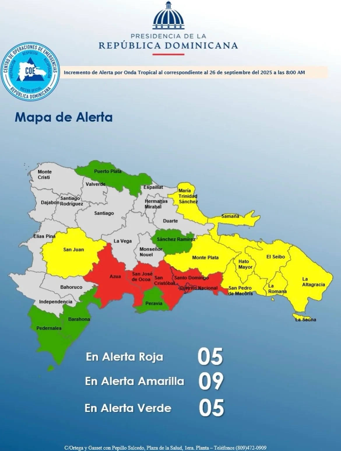 Santo Domingo.-El COE coloca 04 provincias y al Distrito Nacional en alerta roja, mantiene 09 en amarilla y 05 en verde, debido a que el informe del INDOMET, establece que a través de las imágenes de satélite meteorológico se observan nubes generadoras de aguaceros moderados a fuerte con tormentas eléctricas y ráfagas de viento por la incidencia de la activa onda tropical y la vaguada en altura.