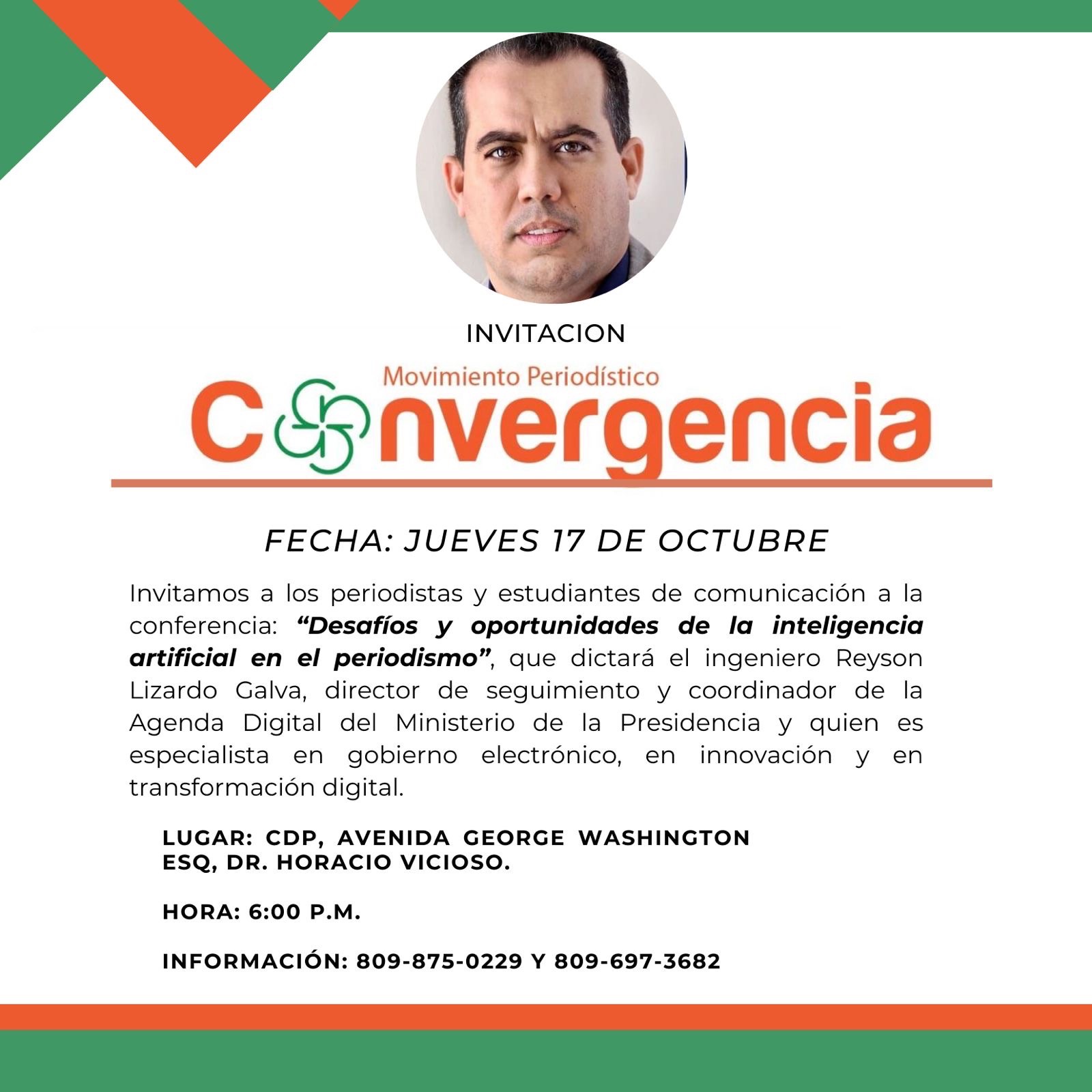 El Movimiento Periodístico Convergencia informó que impartirá la conferencia titulada “Oportunidades y desafíos de la inteligencia artificial en el periodismo”, a cargo del ingeniero Rayson Lizardo Calva, director de seguimiento y coordinación de la Agenda Digital del Ministerio de la Presidencia.