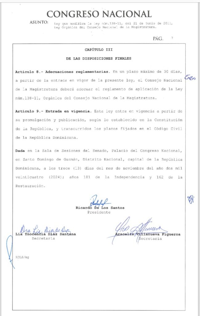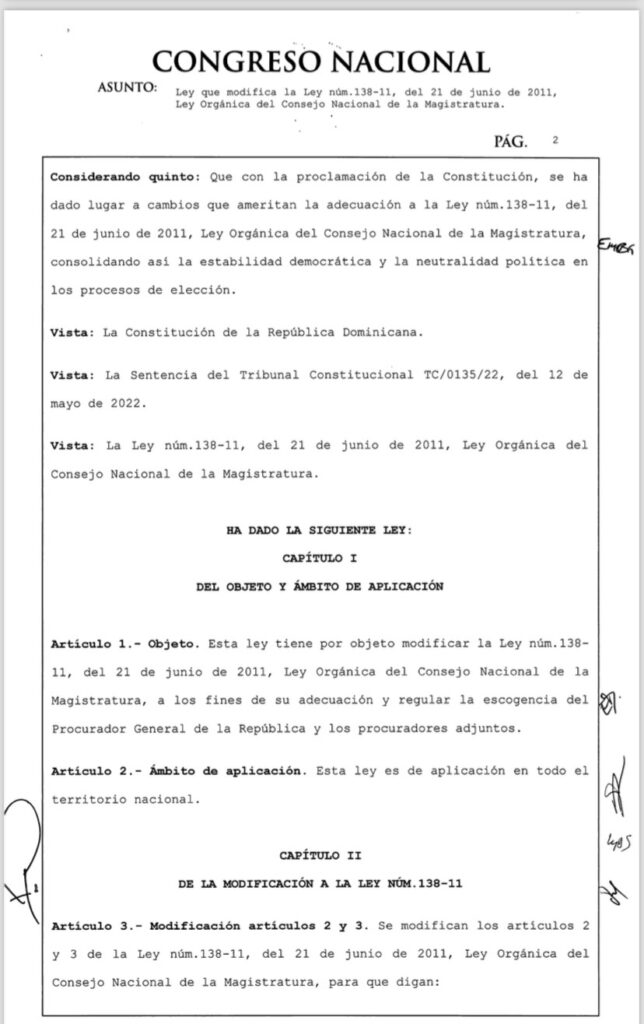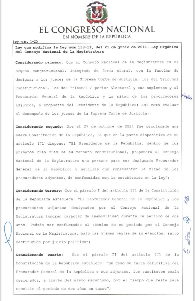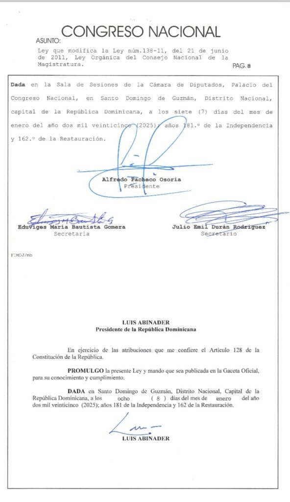 Santo Domingo. – El presidente de la República, Luis Abinader, ha promulgado en el día de hoy, la Ley núm. 1-25 que modifica la Ley núm. 138-11, del 21 de junio de 2011, Orgánica del Consejo Nacional de la Magistratura.