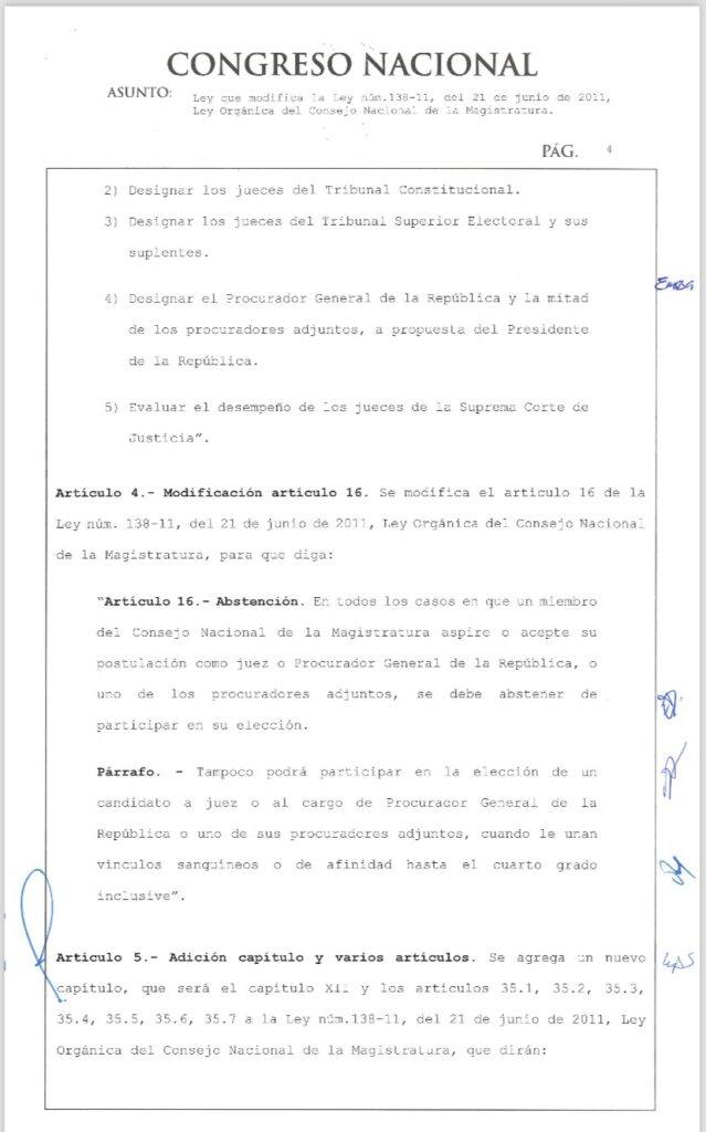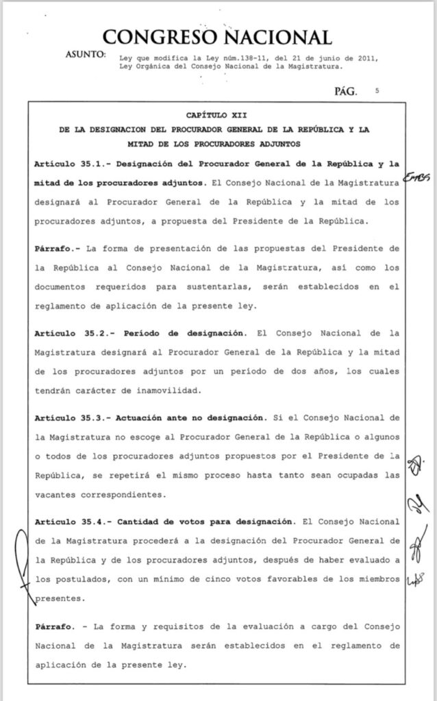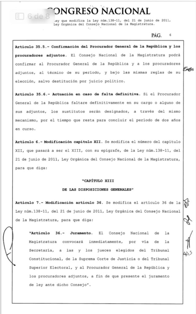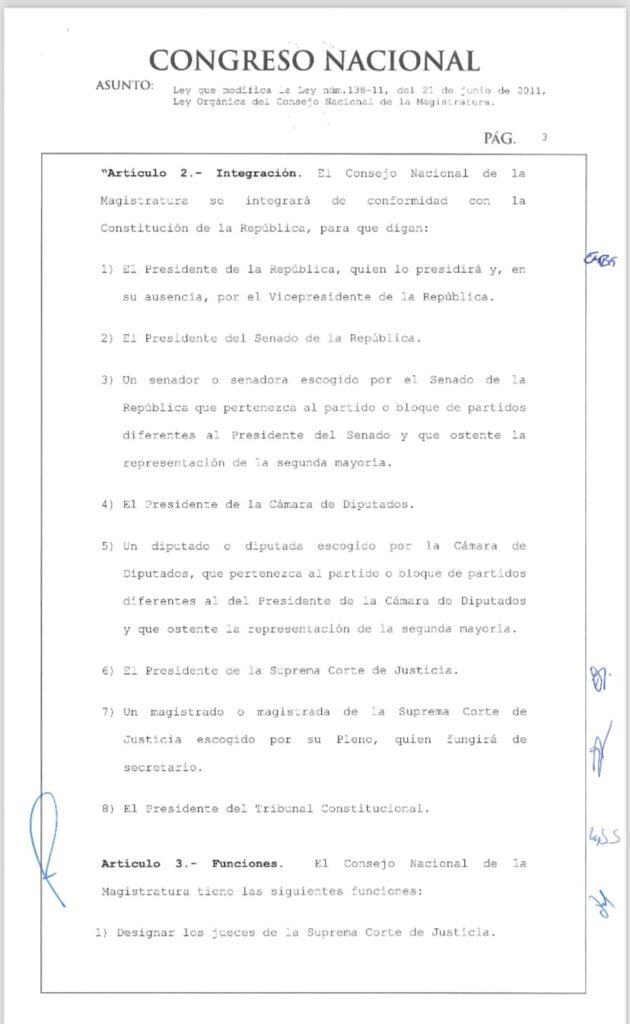 Del mismo modo la ya promulgada Ley núm. 1-25 recoge la introducción del presidente del Tribunal Constitucional como miembro del Consejo Nacional de la Magistratura y la salida del procurador general de la República, figura que se había introducido en la reforma constitucional de 2010.