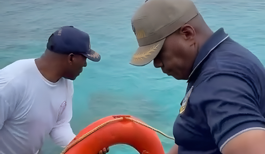 En estos momentos buzos del cuerpo de Bomberos de Santo Domingo Este, proceden a sujetar la polea del petibon de la Dirección General de Seguridad de Tránsito y Transporte Terrestre (Digesett), de del camión encontrado en las aguas del mar caribe a la altura del km 18 de las Américas.