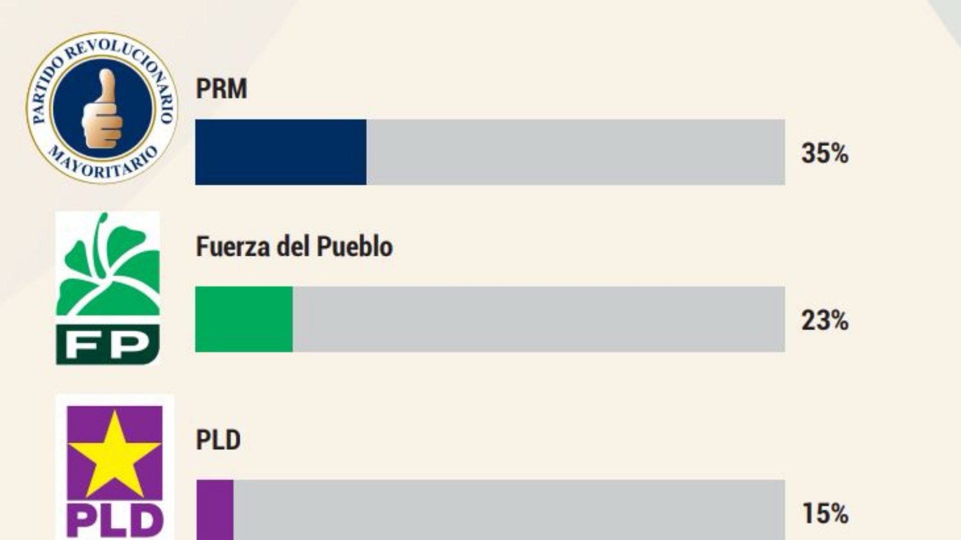 De acuerdo con los resultados del sondeo, la Fuerza del Pueblo (FP) ocupa la segunda posición con un 23 %, mientras que el Partido de la Liberación Dominicana (PLD) se sitúa en el tercer lugar al registrar un 15 % de las respuestas.