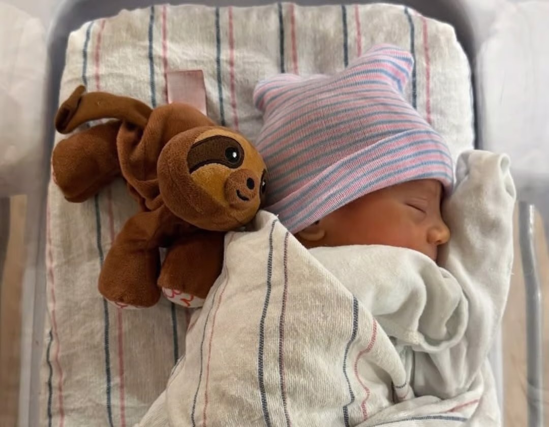 La imagen compartida muestra al recién nacido descansando en una cuna de hospital, arropado con una manta blanca de rayas rosadas y oscuras, y usando un gorrito a juego. A su lado, un pequeño peluche de perezoso acompaña la escena. La pareja no ofreció mayores detalles sobre el sexo o el nombre del bebé.