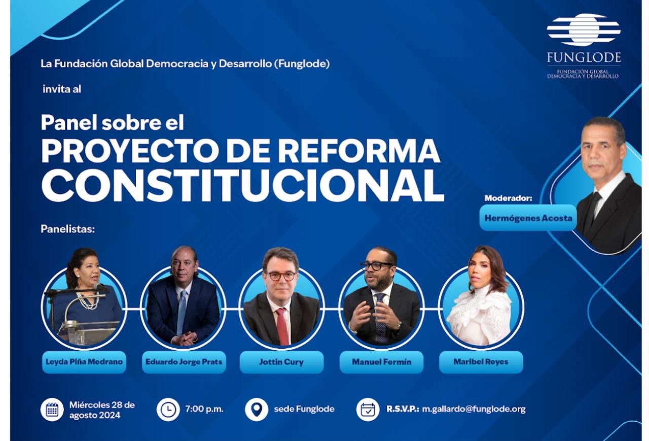 Santo Domingo.- La Fundación Global Democracia y Desarrollo (Funglode) realizará este miércoles 28 de agosto un panel sobre el proyecto de reforma constitucional, con el objetivo de analizar la iniciativa que el Poder Ejecutivo ha enviado al Congreso Nacional y de promover un debate amplio y participativo en torno a esta propuesta.