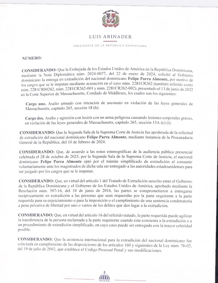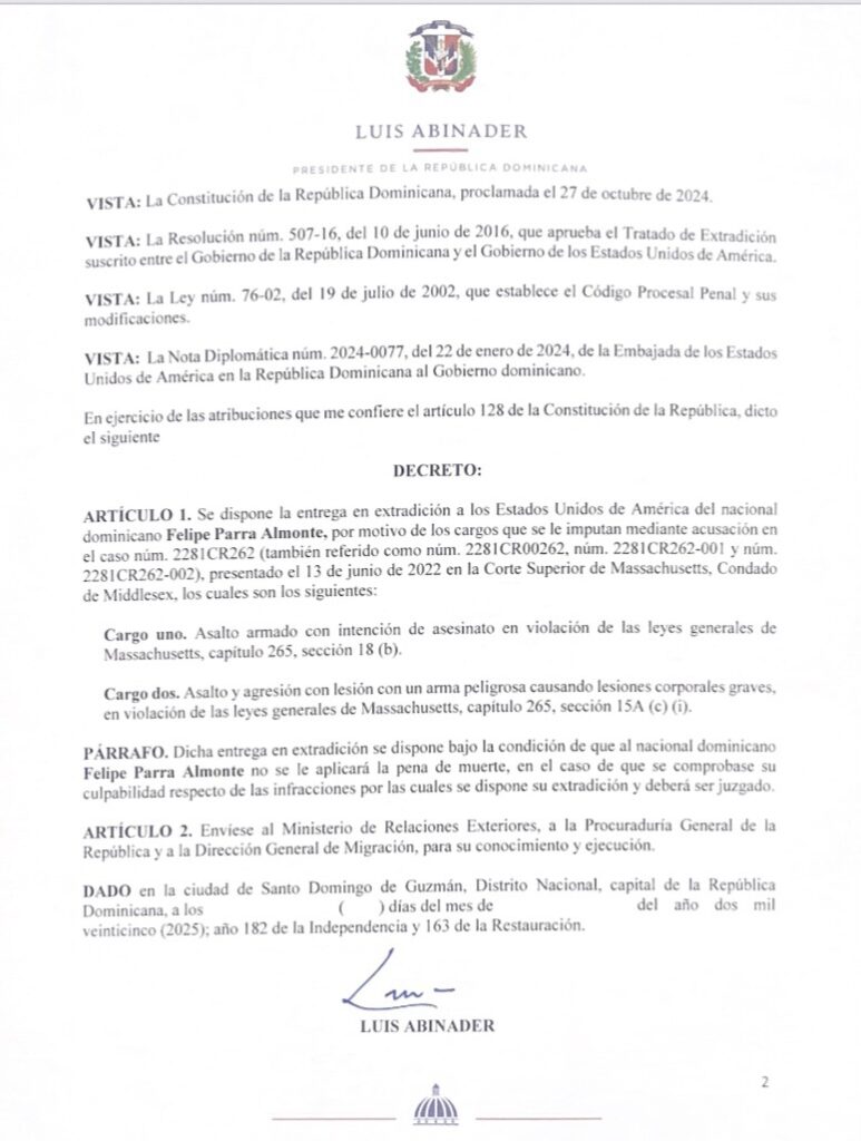 Santo Domingo. El Presidente Luis Abinader emitió un decreto mediante el cual se ordena la extradición del ciudadano dominicano Felipe Parra Almonte, requerido por las autoridades de los Estados Unidos para responder ante la justicia por varios cargos criminales.