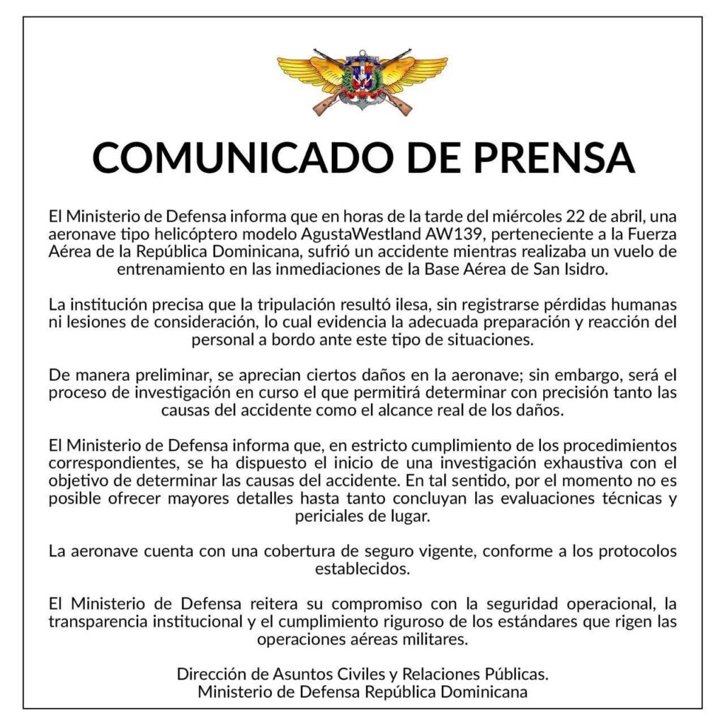 Santo Domingo.-El Ministerio de Defensa informa que en horas de la tarde del miércoles 22 de abril, una aeronave tipo helicóptero modelo AgustaWestland AW139, perteneciente a la Fuerza Aérea de la República Dominicana, sufrió un accidente mientras realizaba un vuelo de entrenamiento en las inmediaciones de la Base Aérea de San Isidro.