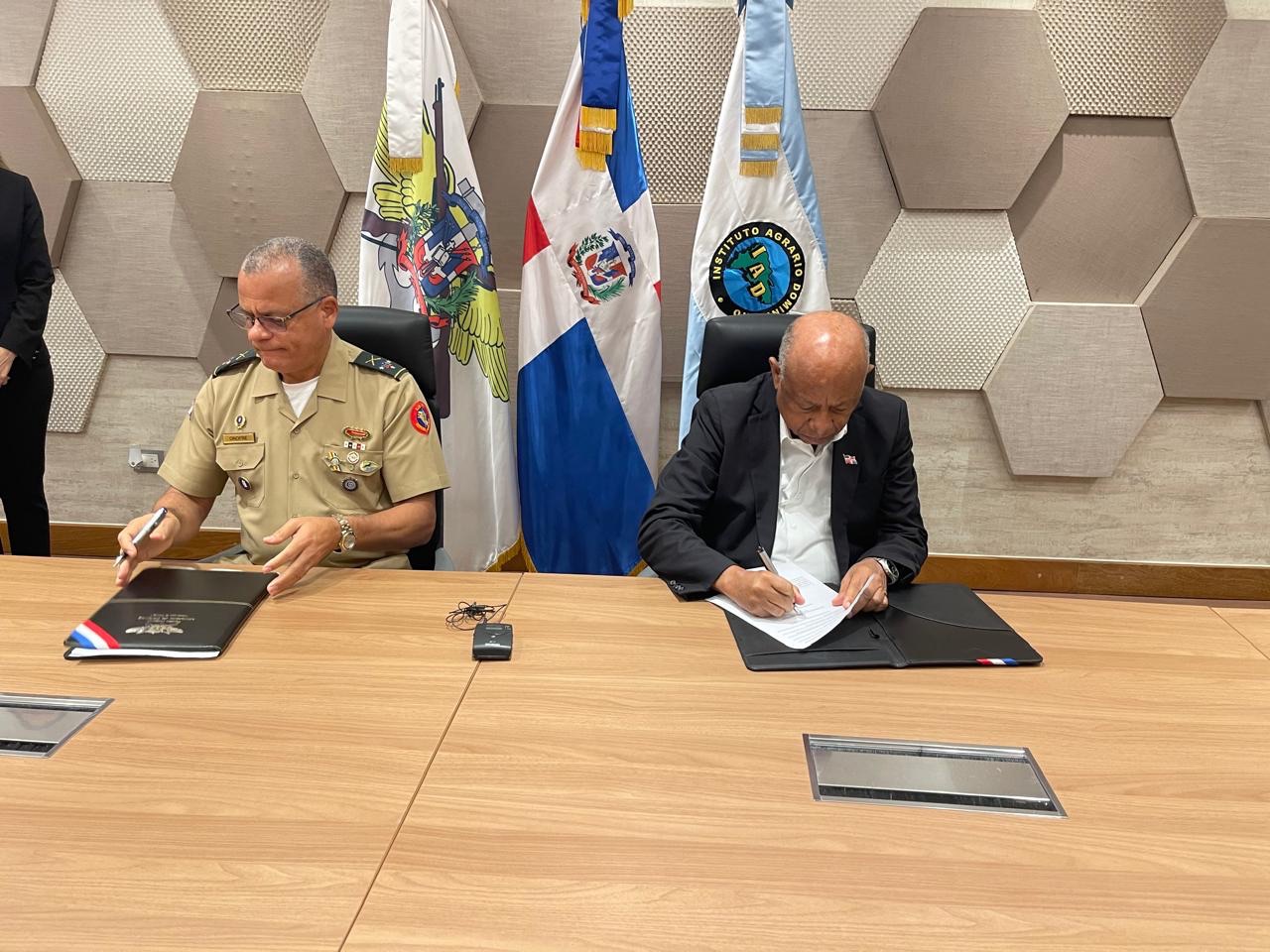 SANTO DOMINGO,R.D.-El Instituto Agrario Dominicano (IAD) y el Ministerio de Defensa (MIDE) suscribieron este martes un convenio mediante el cual la institución rectora de la Reforma Agraria dona una porción de terrenos de 44 mil 688 metros cuadrados, correspondientes a una parcela ubicada en el municipio San Cristóbal, para la construcción de un recinto donde funcionará la Industria Militar Dominicana, generadora de unos 500 empleos directos. que beneficiará tanto a los militares como a la comunidad.