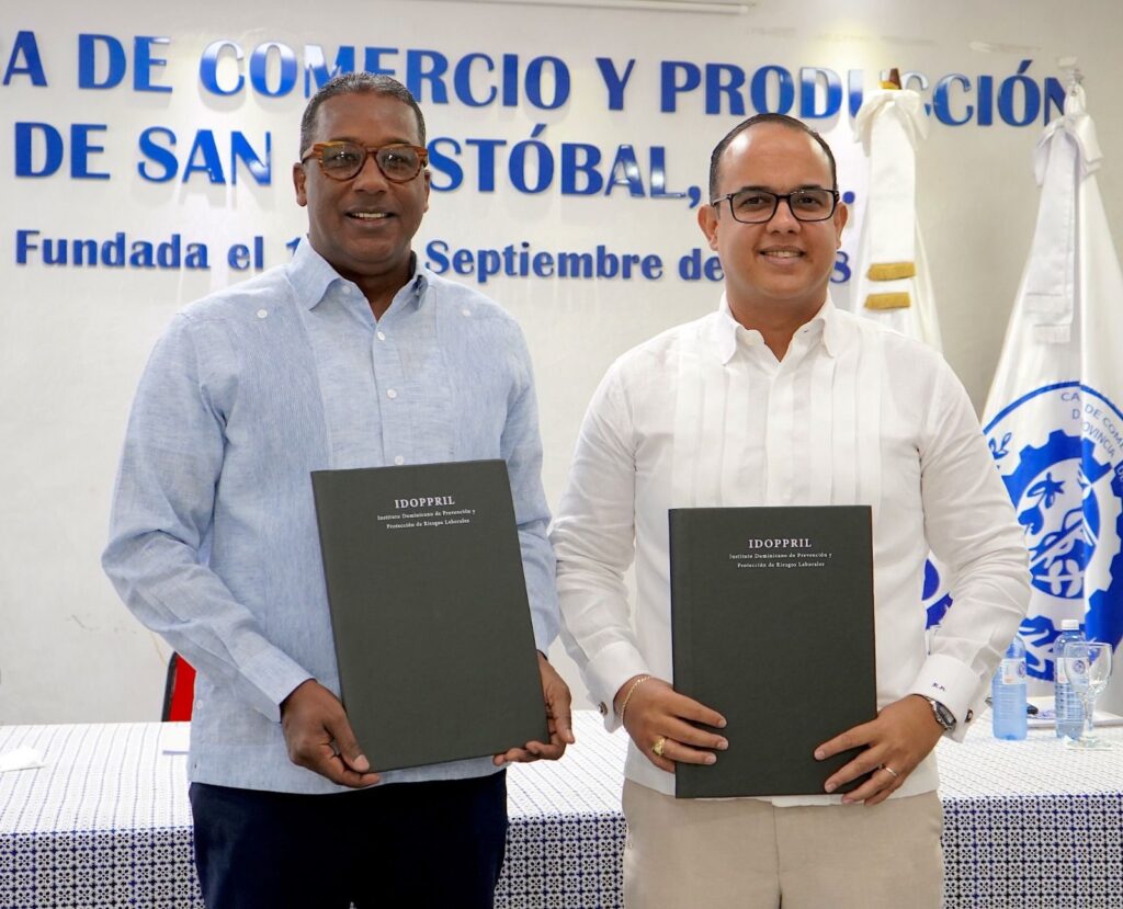 San Cristóbal.-El Instituto Dominicano de Prevención y Protección de Riesgos Laborales (IDOPPRIL) y la Cámara de Comercio y Producción de San Cristóbal suscribiendo un convenio para desarrollar acciones conjuntas orientadas a promover la seguridad ocupacional en las empresas de esta provincia.