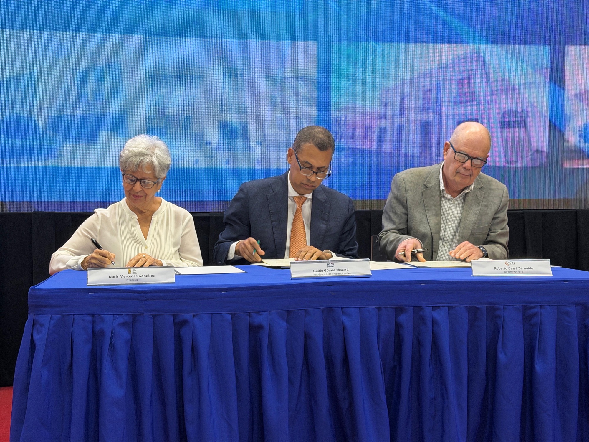 Los acuerdos fueron suscritos por Guido Gómez Mazara, presidente del Consejo Directivo del Indotel; Roberto Cassá, director general del AGN; y Noris Mercedes González Mirabal, presidenta de la Fundación Museo Memorial de la Resistencia Dominicana.