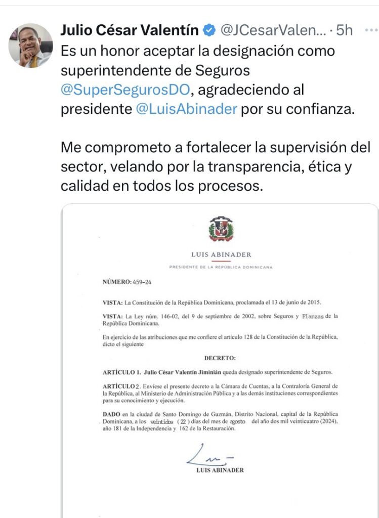 Julio César Valentín, abogado recientemente designado como Superintendente de Seguros, expresó su profundo agradecimiento al presidente Luis Abinader por la confianza depositada en él. A través de su cuenta de X, Valentín compartió su entusiasmo por asumir este nuevo desafío.