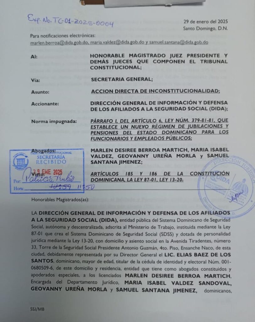 Santo Domingo.-La Dirección General de Información y Defensa de los Afiliados a la Seguridad Social (DIDA) presentó una acción directa de inconstitucionalidad ante el Tribunal Constitucional contra el párrafo I del artículo 6 de la Ley núm. 379-81, que regula el régimen de pensiones del Estado dominicano.