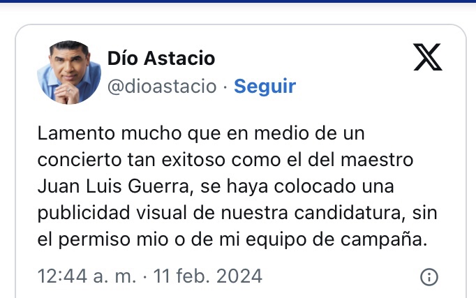 En su red social de X (antes Twitter), el político dijo que “Lamento mucho que en medio de un concierto tan exitoso como el del maestro Juan Luis Guerra, se haya colocado una publicidad visual de nuestra candidatura, sin el permiso mío o de mi equipo de campaña”.