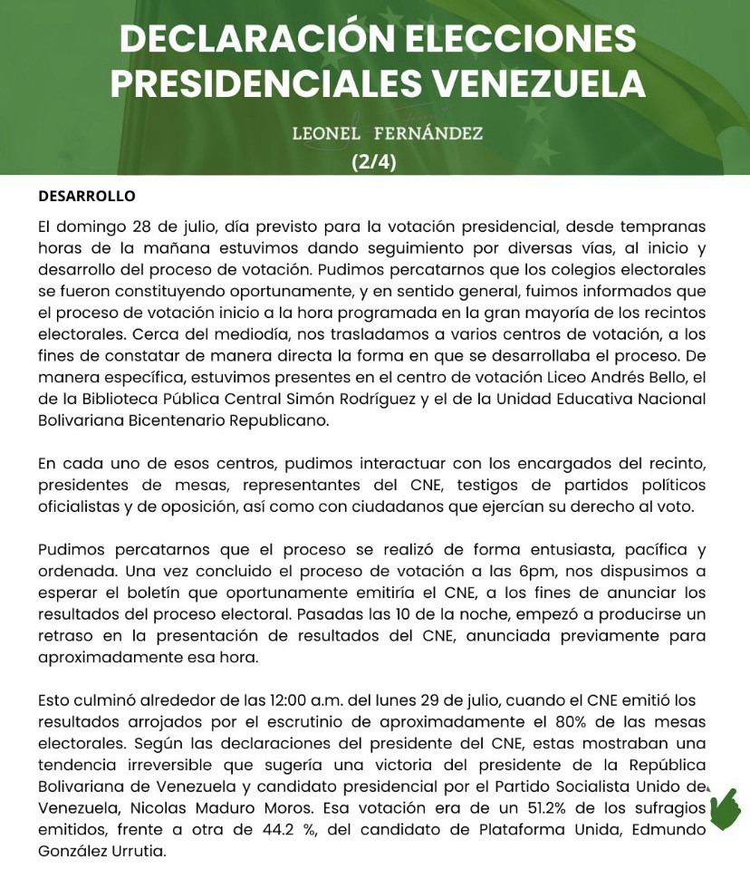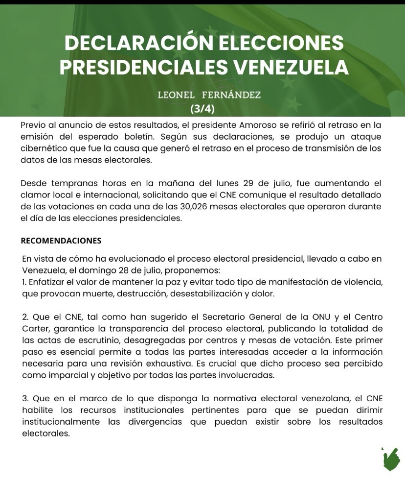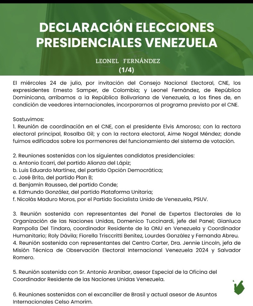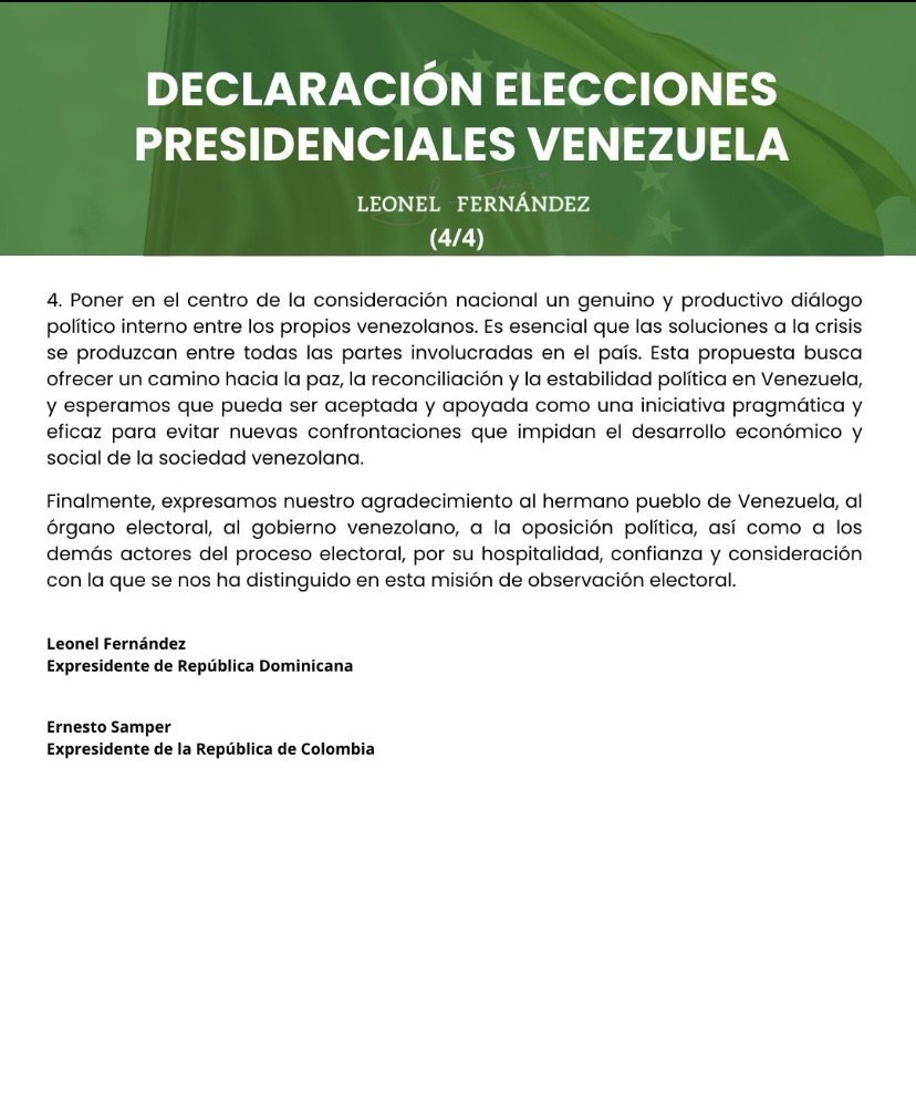 Caracas, Venezuela – Los expresidentes de la República Dominicana y de Colombia, Leonel Fernández y Ernesto Samper, presentaron la noche de este lunes sus recomendaciones para una posible salida a la situación que vive la República Bolivariana de Venezuela, después del proceso electoral presidencial llevado a cabo el domingo pasado.
