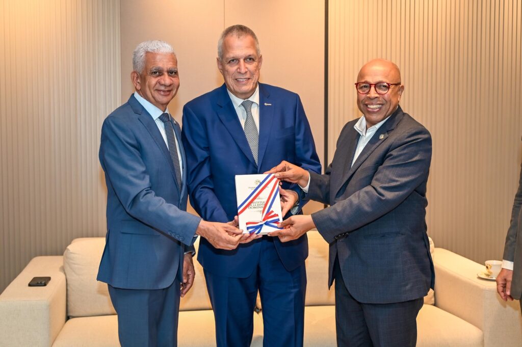 Como un gesto de cortesía, Ricardo de los Santos y Alfredo Pacheco, obsequiaron al senador Germán Blanco Álvarez, un ejemplar tamaño libro de la nueva Constitución Dominicana.