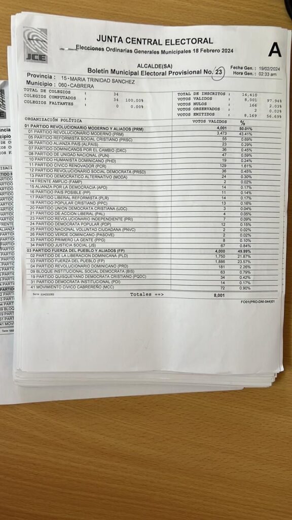 Explicó “a todo el pueblo de Cabrera y al país, que en Cabrera aún la Junta Central Electoral (JCE) no ha declarado ganador de la alcaldía municipal a ninguno de los contendientes, en virtud de que hay un empate técnico por una diferencia de 1 voto”.
