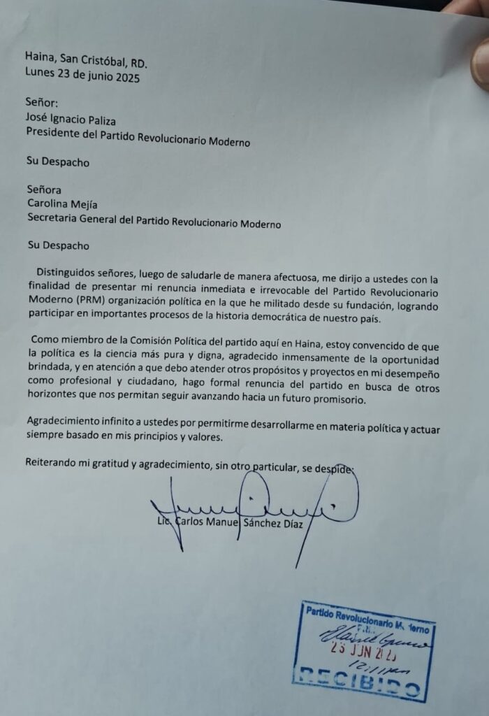 Carlos Sánchez Díaz, quien además es abogado y representante de los Derechos Humanos, tras hacer formal renuncia del PRM, indicó «agradecido inmensamente de la oportunidad brindada, debido a que tengo que atender otros proyectos en mi desempeño como profesional y ciudadano, hago formal renuncia del partido en busca de otros horizontes que nos permitan seguir avanzando hacia un futuro promisorio» indicó.