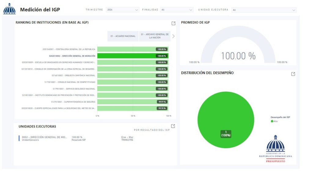 El Índice de Gestión Presupuestaria (IGP) dentro de la Dirección General de Presupuesto (Digepress) tiene como intención medir a todas las instituciones del Sector Público, partiendo de las que aplican en el cumplimiento de criterios utilizar el SIGEF como sistema de gestión financiera; tener portal de transparencia institucional regulado por la DIGEIG y contar con programación de producción de bienes y servicios (presupuesto físico) en la DIGEPRES.