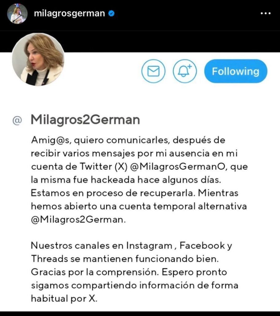 En un mensaje publicado en dicha red social, Germán escribió: «Amig@s, quiero comunicarles, después de recibir varios mensajes por mi ausencia en mi cuenta de Twitter (X) @MilagrosGermanO, que la misma fue hackeada hace algunos días».