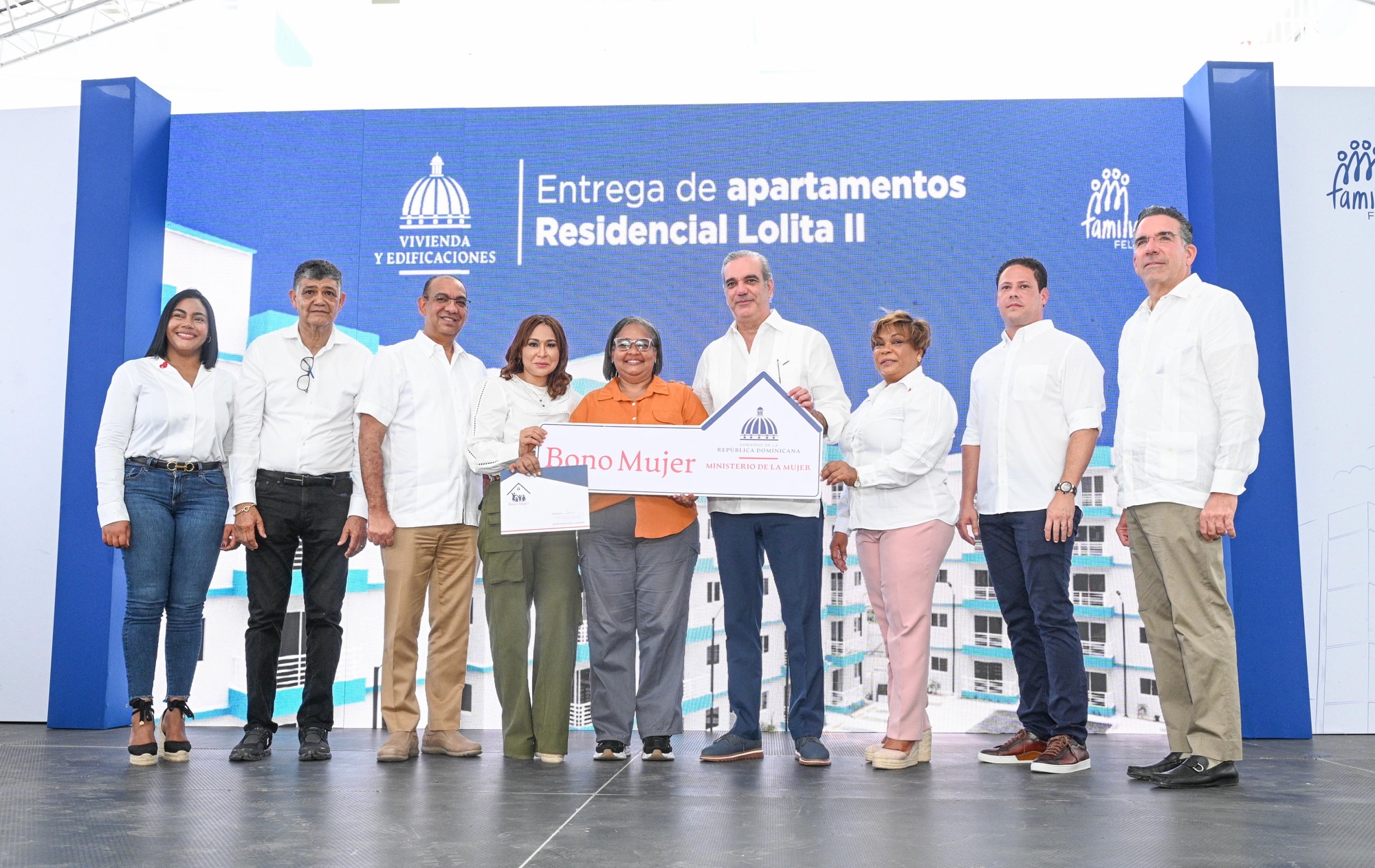 Santo Domingo.-En un acto encabezado por el presidente de la República, Luis Abinader; la ministra de la Mujer, Mayra Jiménez; y el ministro de Viviendas y Edificaciones, Carlos Bonilla, el Ministerio de la Mujer entregó RD$ 6,940,000.00 millones de pesos en Bono Mujer, en el marco del Plan Nacional de Viviendas Familia Feliz, en el proyecto Residencial Lolita II, en Hato Nuevo de Manoguayabo, en Santo Domingo Oeste.