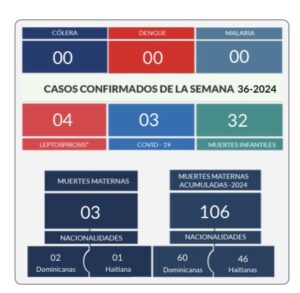 Durante esta semana epidemiológica 36-2024 se reportaron 3 defunciones de muertes maternas de las cuales corresponden a la nacionalidad dominicana. Siendo dos de Santo Domingo y uno de Santiago Rodríguez.