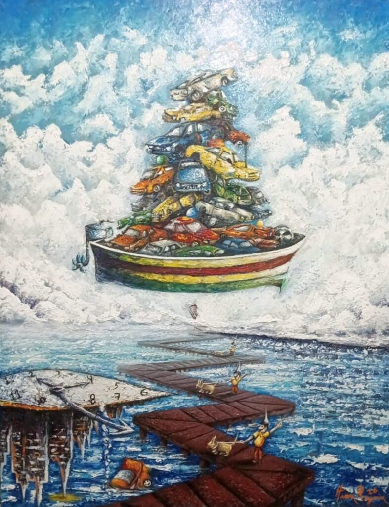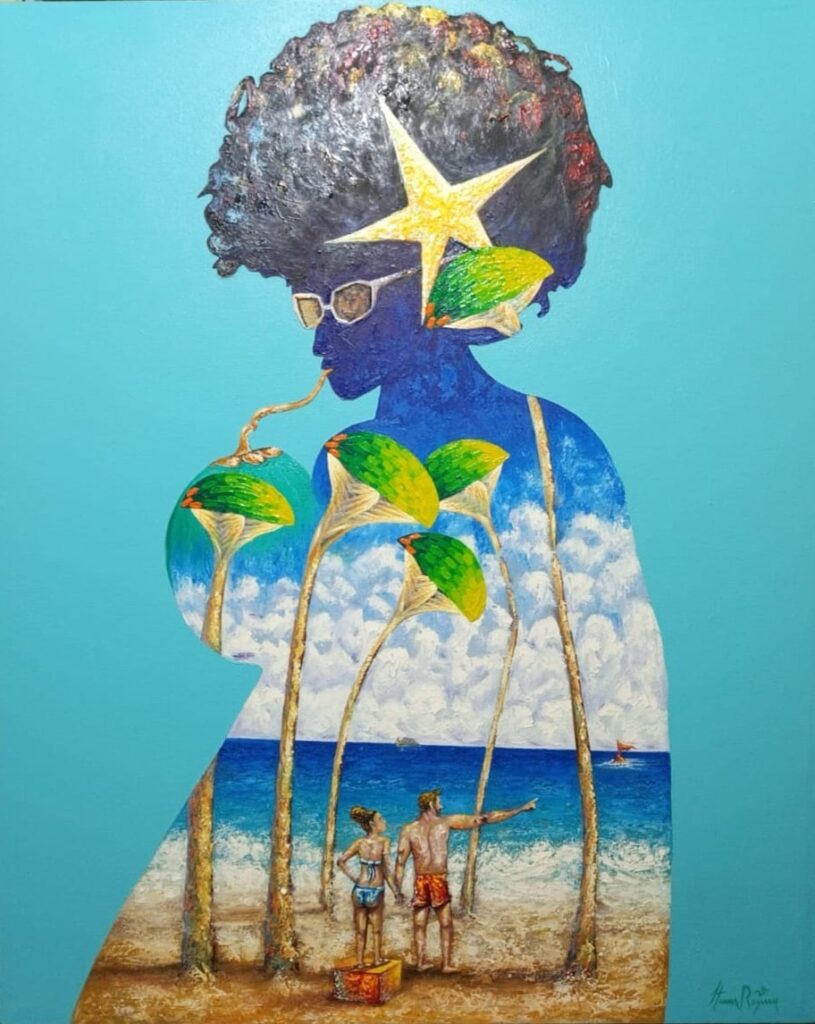 Funciona como sistema. Como arquitectura interior. Cada figura, cada espacio suspendido, cada deformación responde a una lógica emocional más que física. Si el surrealismo fue en su origen una ruptura con la razón positivista, en Reynoso se convierte en método contemporáneo para explorar las fracturas del sujeto caribeño postcolonial.”