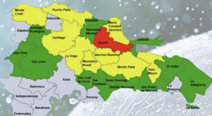 A partir del mediodía, ocurrirán otros incrementos nubosos notables que descargarán fuertes aguaceros,tormentas eléctricas y ráfagas deviento aisladas, en poblados del noreste, sureste, suroeste, cordillera Central y Valle del Cibao, como son: San Cristóbal, San José de Ocoa, Azua, San Juan, Elías Pina, Dajabón, Independencia, Bahoruco, El Seibo, Hato Mayor, Monte Plata, Samaná, Duarte, Sánchez Ramírez, La Vega, Monseñor Nouel, entre otras áreas, causadas por la humedad en nuestra masa de aire y los efectos de una vaguada en niveles bajos.