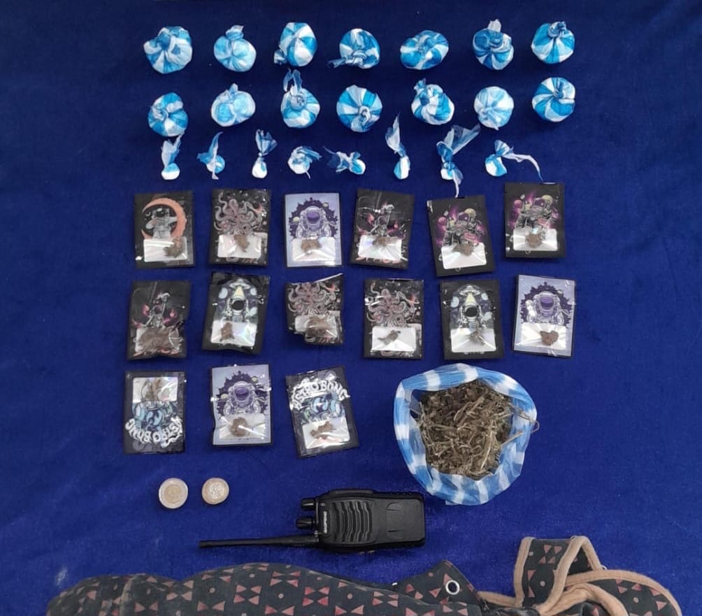 También se incautaron 07 celulares, un arma casera (Chagon), un cuchillo, dos balanzas, tres tijeras, una motocicleta, una radio de comunicación, fundas y otros materiales para la preparación y empaque de narcóticos.