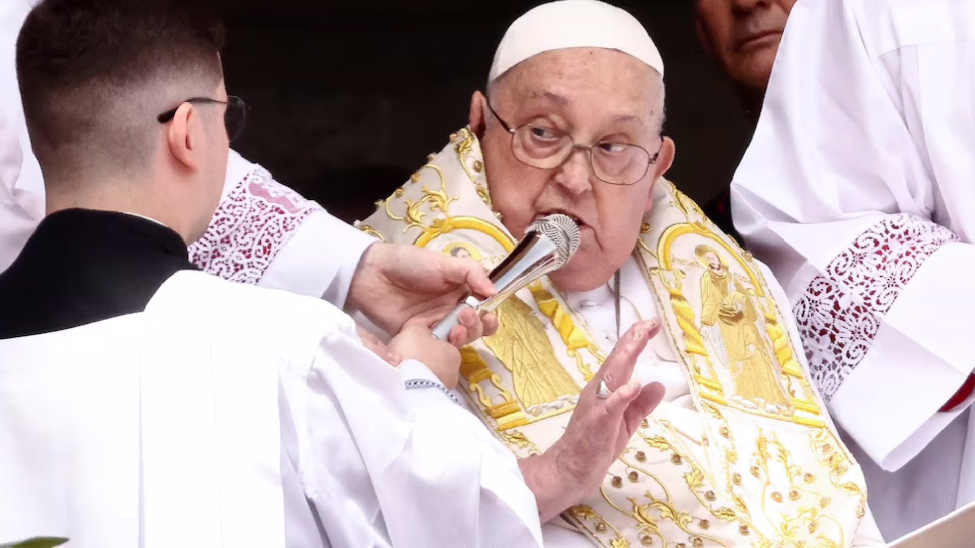 La misa del Domingo de Resurrección fue celebrada por el cardenal Angelo Comastri. El papa, por su parte, se limitó a desear una “buena Pascua” al inicio y no utilizó las cánulas de oxígeno que había llevado en otras apariciones recientes.