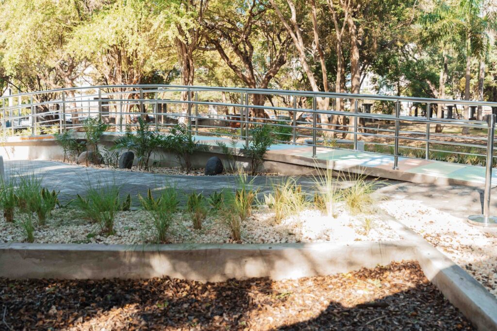 Ubicado en la zona oeste del parque Iberoamérica, el Puente Arcoíris se integra de manera armoniosa al entorno natural de este importante pulmón verde de la ciudad, ofreciendo un lugar de recogimiento, reflexión y conexión emocional dentro de un espacio público accesible para todos.